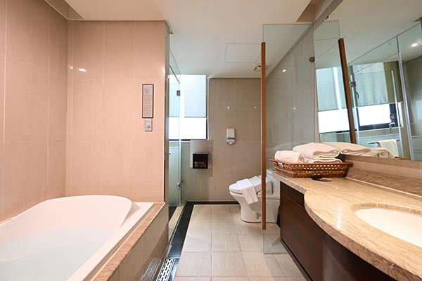 微風SPA擁有飯店級的頂級裝潢與隱密空間,按摩房皆為實牆隔間的獨立包廂,讓貴賓能沉浸在靜謐氛圍中。結束後免費使用飯店客房沐浴(請先預約以茲安排),包括乾溼分離浴缸、寬闊化妝室與休息空間。